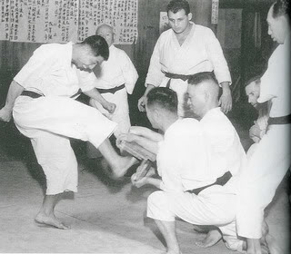 « El final de la   guerra nos trajo la ocupación, y entonces algunos soldados americanos   empezaron a visitarme y pedirme que les enseñara Karate. [...] Tuve   muchas experiencias con visitantes y militares americanos del ejército   de ocupación, y pronto me acostumbré a ver caras extranjeras (incluidas   algunas femeninas) en el Dojo de Karate Kyokai. »