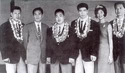 Después de firmarse el tratado de paz entre Japón y los EEUU (1951),   un oficial americano de alto rango pidió al Maestro Funakoshi que   visitara durante tres meses las bases americanas en el Continente,   haciendo exhibiciones de Karate para los pilotos americanos. El Maestro   escogió como ayudantes a OBATA Isao (Universidad de Keio), KAMATA Toshio   (Universidad de Waseda) y NAKAYAMA Masatoshi (Universidad de   Takushoku).